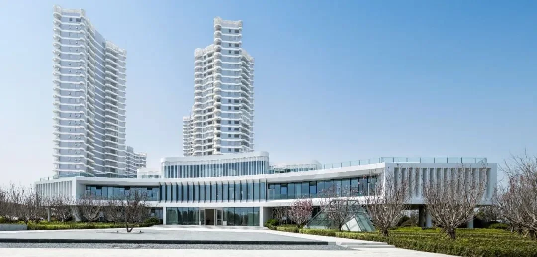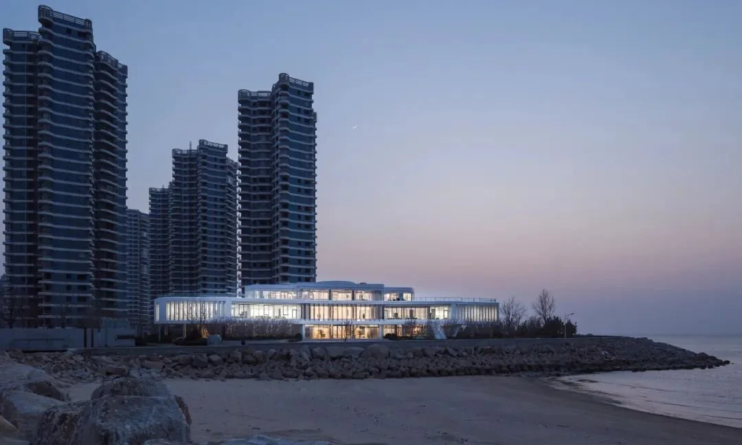 建筑的二层向四周悬挑,成为整座建筑的形象主体,水平伸展的白色形体犹如瞭望平台,又好似展开的翅膀。建筑的三层收缩至建筑的中心,强化中轴对称的布局。三层的外立面采用玻璃幕墙外加竖格栅的形式,营造出朦胧的层叠感。在白天,竖格栅对室内遮阳,对室外过滤玻璃反射;在夜晚,当室内灯光亮起,它便成为海边的‘灯塔’。