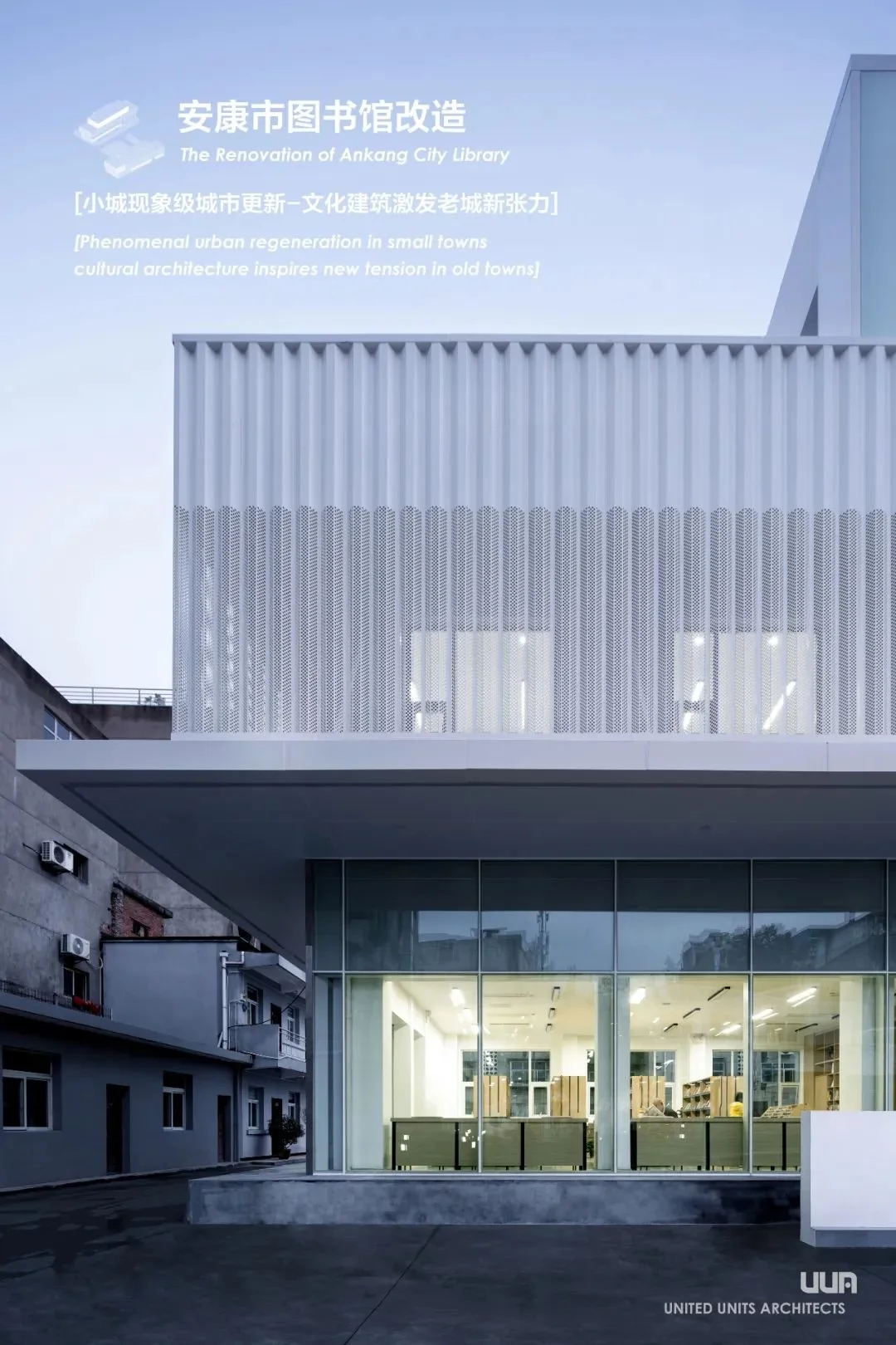 UUA将陈旧的安康市图书馆老馆改造为一个崭新的,开放的,对当代人有吸引力的公共场所,突显与周围老旧环境的强烈反差。40年的时间跨度,出现在同一场所,宛若一场超现实的时空错位。