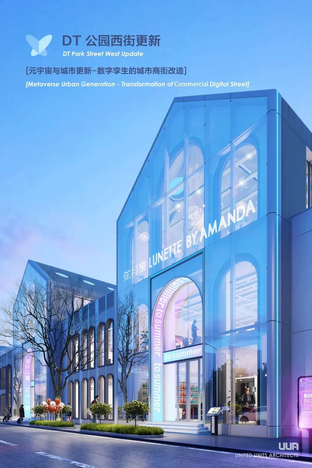 DT公园西街数字孪生商街更新方案的探索和设计,是UUA对于城市更新新方向的探索,它的更新方式除了传统的建筑手段,同时媒体设备在建筑立面和幕墙的整合,导视系统和数字孪生的整合,线下线上的整合,虚拟现实和与增强现实技术的加入,使得公园西街的城市更新在新时代新需求新语境下有了新的呈现。