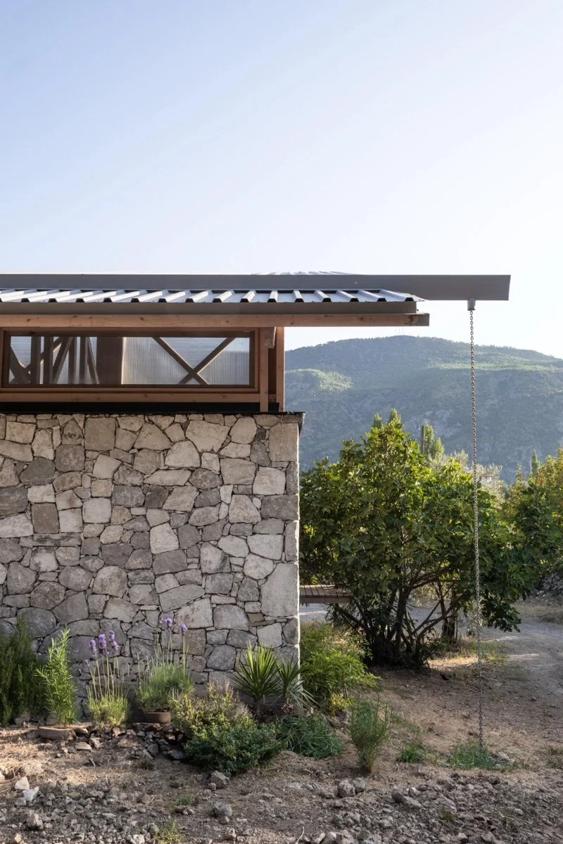 南立面 - 不透明且保护性:朝南的立面采用厚实的回收石墙建造,提供了坚固、不透明的屏障,抵御强烈的地中海阳光和热量。这些石头是从原始村庄房屋中精心回收的,提供了强大的热质量,在炎热的夏季自然冷却室内。木结构支撑着遮阳装置和战略性放置的小开口,允许控制通风,减少对人工冷却的需求。