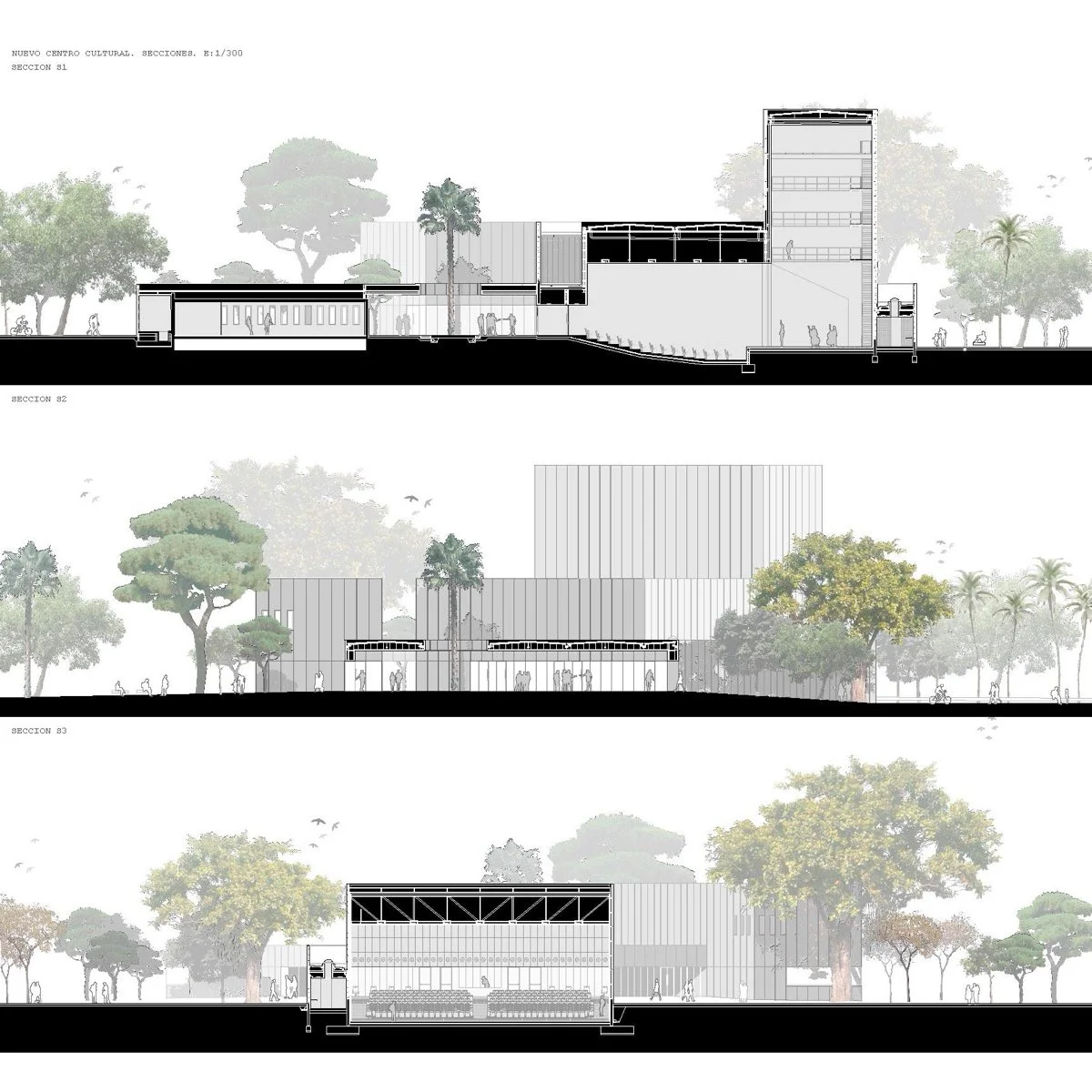获胜方案认为,阿尔曼萨公园应当是一个文化交汇的公共空间,一个尊重环境并促进平等与社会关系的地方,一个能够加强邻里关系和市民归属感的空间。它是一个开放、灵活、没有建筑障碍的空间,各类活动可以在这里交织进行,在这里集体与个体并存;它面向广泛的人群,从儿童到老年人,是一个包容性的空间,只有通过回应多样性,才能确保社会的全面发展。阿尔曼萨公园介于自然公园和城市广场之间的尺度,置身于城市公园的范畴。为了与城市接轨,公园的边界需要避免成为两个对立现实(休闲/工作、自然/人工、公园/城市)之间的隔阂,而是使两者之间的过渡变得平缓和渐进。因此,围栏的布置远离了公园边界,创造了扩张和收缩的空间,在这些被让出的空间中形成了广场(聚会场所)。进入公园后,路线和视线不再仅仅回应城市,而是指向景观。三个元素(围栏、地面和树木)相互交叠,帮助模糊界限。