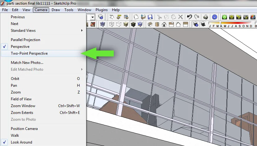 如果你使用 SketchUp,这里有一个设置可以来调整直上直下的垂直元素。只要选择“照相机”在用户界面的顶部,并选择“两点透视”。