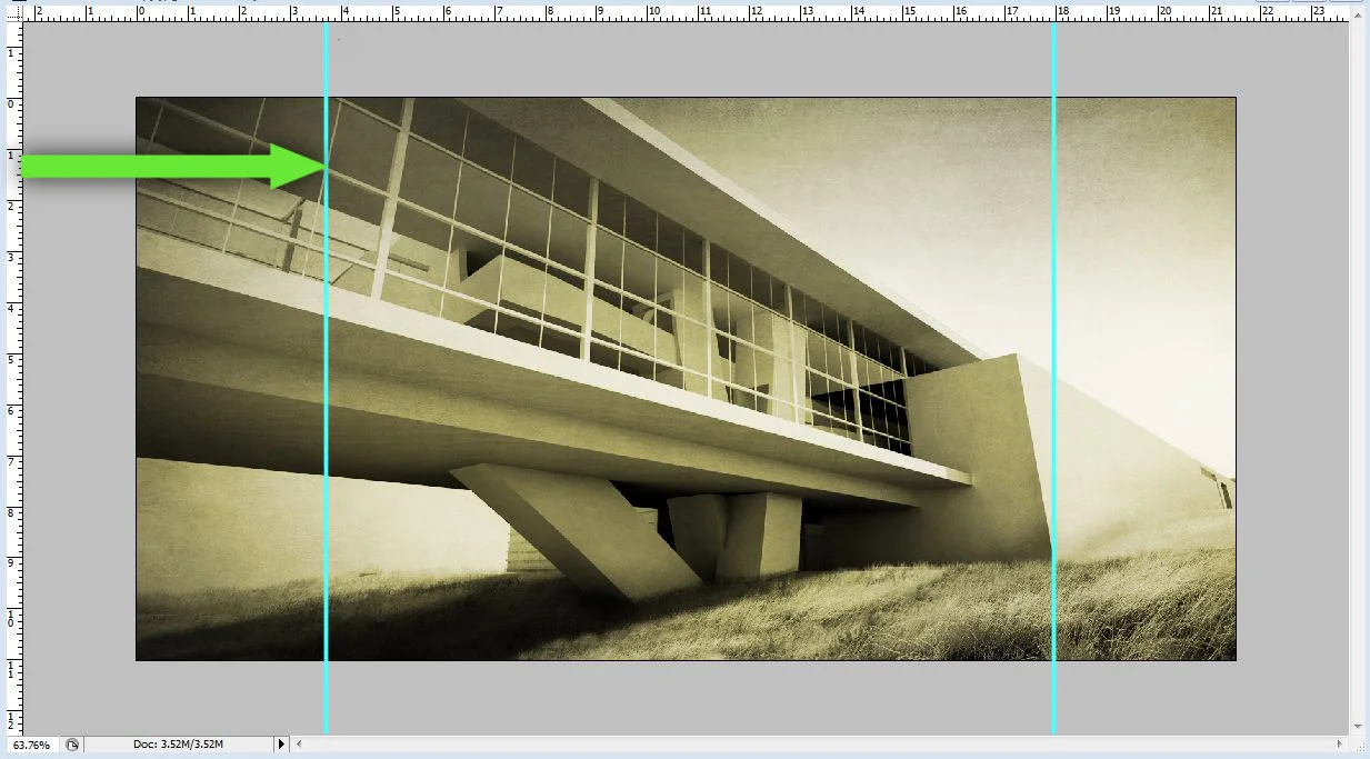 2. 如果你的标尺没有打开,进入“查看”,选择“标尺”(Rulers)。用移动工具点击标尺,并拖动到右侧来创建引导线。这些将作为参考来垂直对齐图像。
