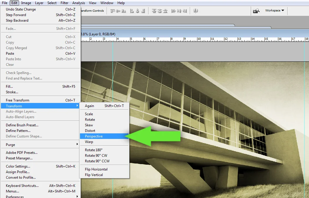 3. 在顶部选择“编辑”,选择“变形>透视”(Transform> Perspective)。
