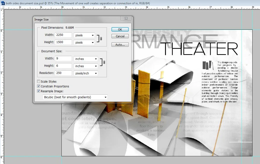 由于我的作品集为双面,我设置的 Photoshop 文件中通过这样的方式,面对面的页面总是相同的项目,因此,可以使用一个 Photoshop 文档。为了说明,而不是有一堆 6-1/4“×9-1/4” 的页面,我用 6-1/4“X18-1/4” 尺寸的页面代替,我后来分成两页时,准备打印。同样,这允许同一个项目的页面之间有更好的关系。当我正准备来划分的页面,我只是裁剪完整的图像变为一个页面,那么其他的,并保存在单独的页面。多次检查图像的大小,以确保该页面仍然是正确的尺寸。