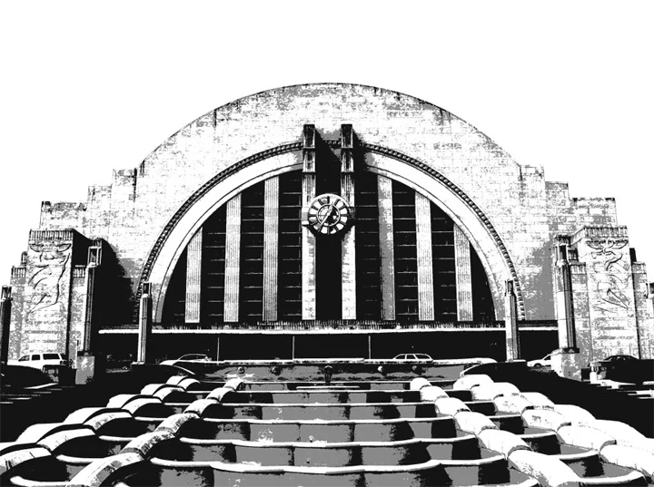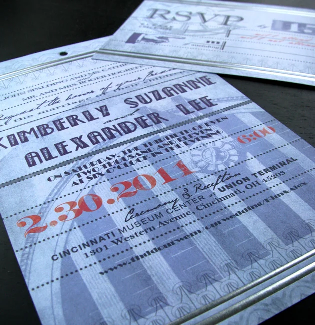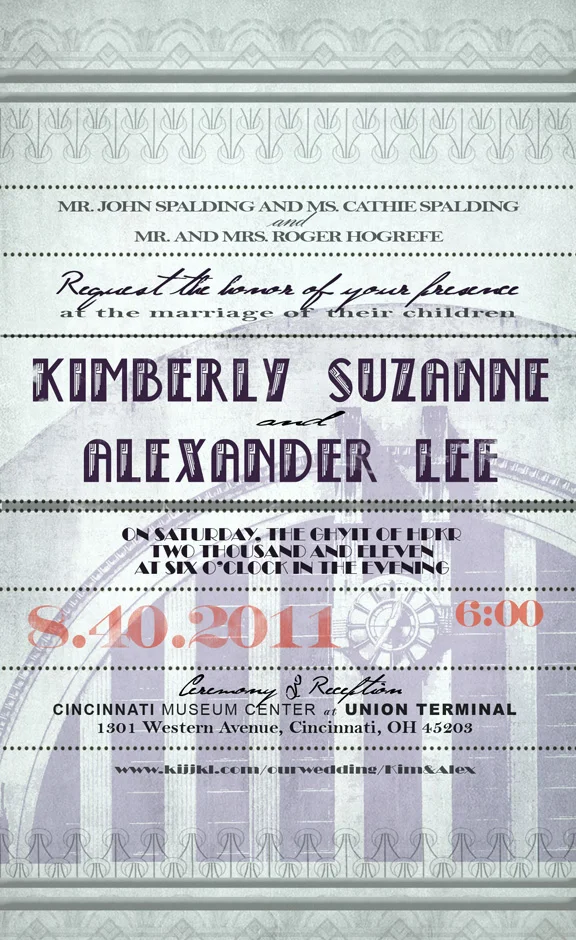 作为一个建筑师,我对我们将要结婚的这个建筑感到十分幸福。这是一个 1930 年的装饰艺术(art deco)风格的在俄亥俄的辛辛那提火车客运站,被美国建筑师学会评为美国典型代表建筑的排名前50的建筑之一。前厅是一个主要的圆形大厅,它在一个 180’x 106’ 的穹顶下方。我们使用一个复古的装饰艺术(art deco)风格的邀请函来向这个建筑致敬是有道理的。
