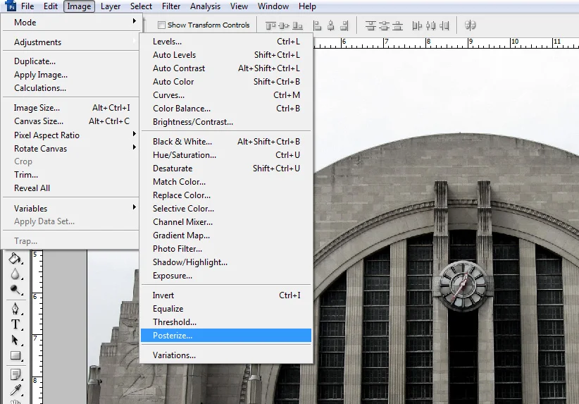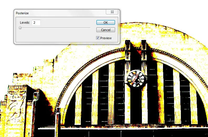 色调分离选项可以在“图像>调整>色调分离(Image>Adjustments>Posterize)”中被找到。我把它控制在 2 或者 3 的等级,使大部分的细节和渐变都丢失。