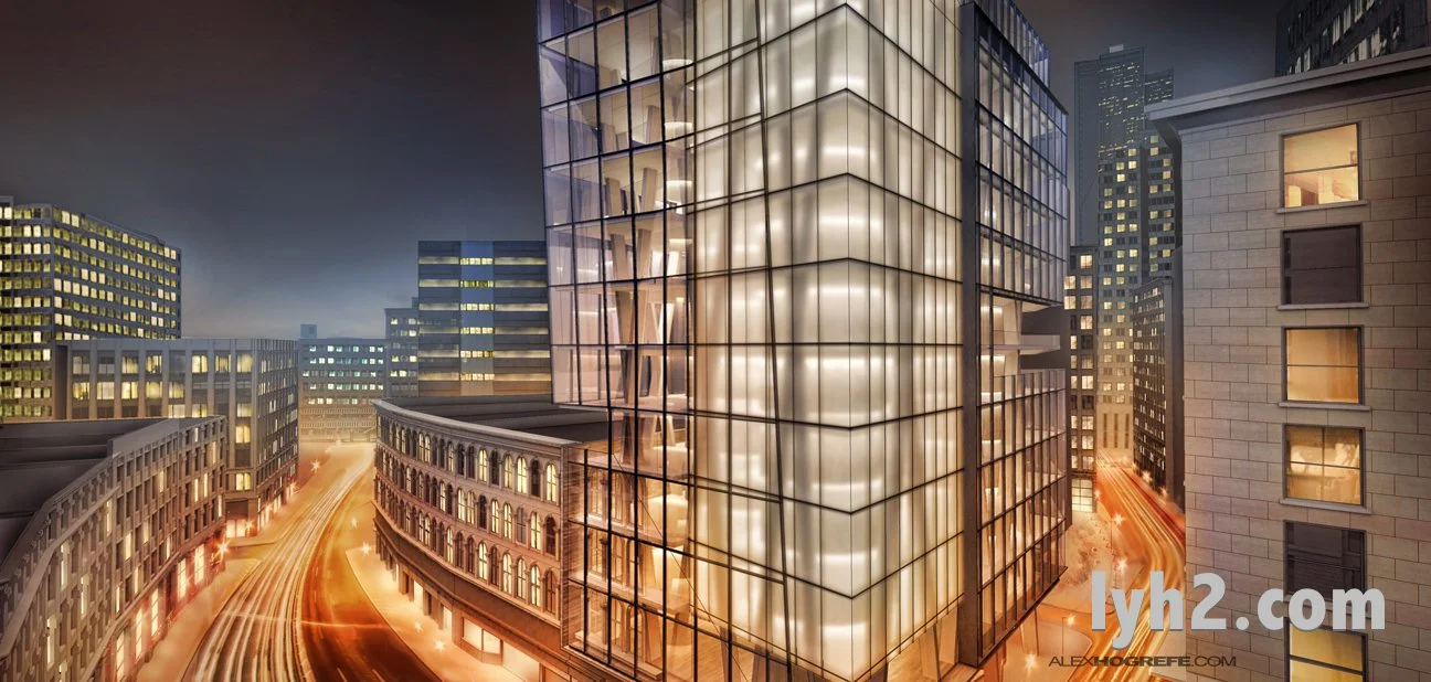 自从一个月前我首次开始建这个 SketchUp 模型,我就开始期待做这个渲染图了。我所关注的许多区域都是塔楼的半透明玻璃,它们激活了下方的街道。我昨晚建好了模型,然后在 Kerythea 里渲了一晚上。我今天早上在 PS 里开始 P 图,大概 8 小时后完成。就在 P 图环节所花费的时间而言,这张图片是我花费时间最多的一张。我选了一个有些非常规的视角,塔楼的上部和底部都被剪切掉了。我希望镜头聚焦在塔楼立面上的半透明玻璃。下面是这张图片的分解步骤。
