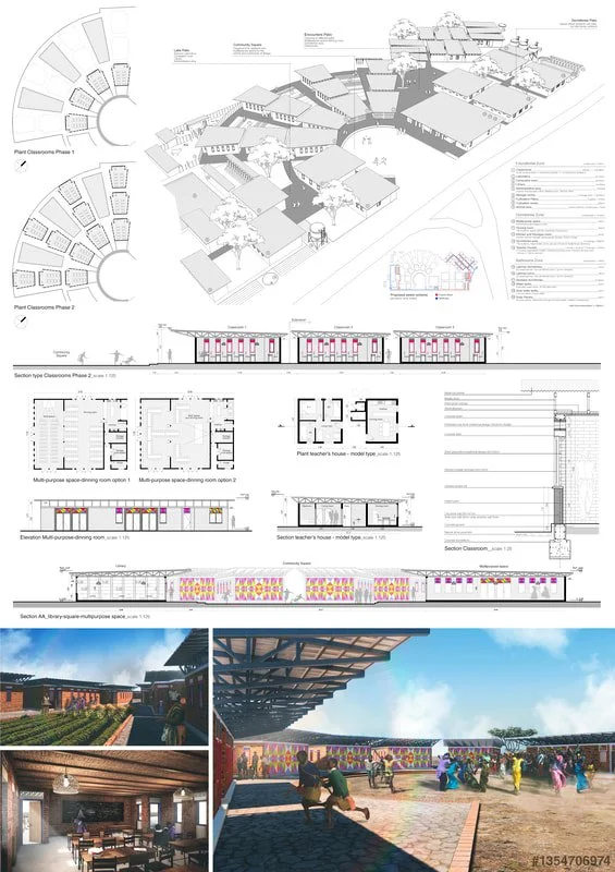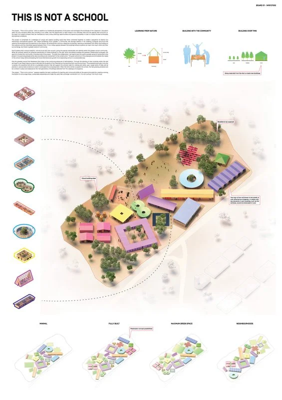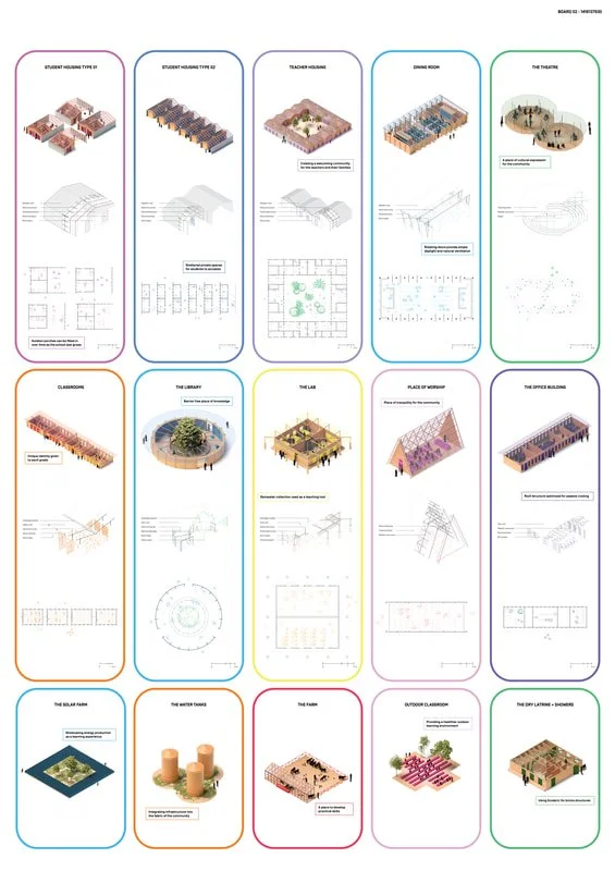 该设计方案创造了一条单向的林荫道,由一个受控的入口点进入,教师设施靠近这个入口点,作为对学生宿舍的一种保护。这些房屋的姿势模仿周围地区建造了茅草屋顶,住宅区域棱角分明的几何形状与以学生活动区域的弧形表面形成了对比。用于通往内环的道路,在一定程度上也能容纳大多数车辆。图书馆作为知识的化身则代表了路径的最终目的地。围绕图书馆的组建策略是为了维持从图书馆中心能看到附近树木的良好视野。径向边界内的其余部分被用来实现校园的其他功能,例如,教室按教育阶段排列成群。我们通过研究确认了该项目的额外功能需求,比如一个实验花园(位于厨房附近)、一个诊所和一个四人足球场等。通过环境协调的方法,我们利用建筑设备的优势来保护和管理环境。被动式冷却、太阳能、水培法和选择性灌溉有助于实现这些目标。材料、系统和组件的设计都考虑了在当地的可利用性和资源范围。