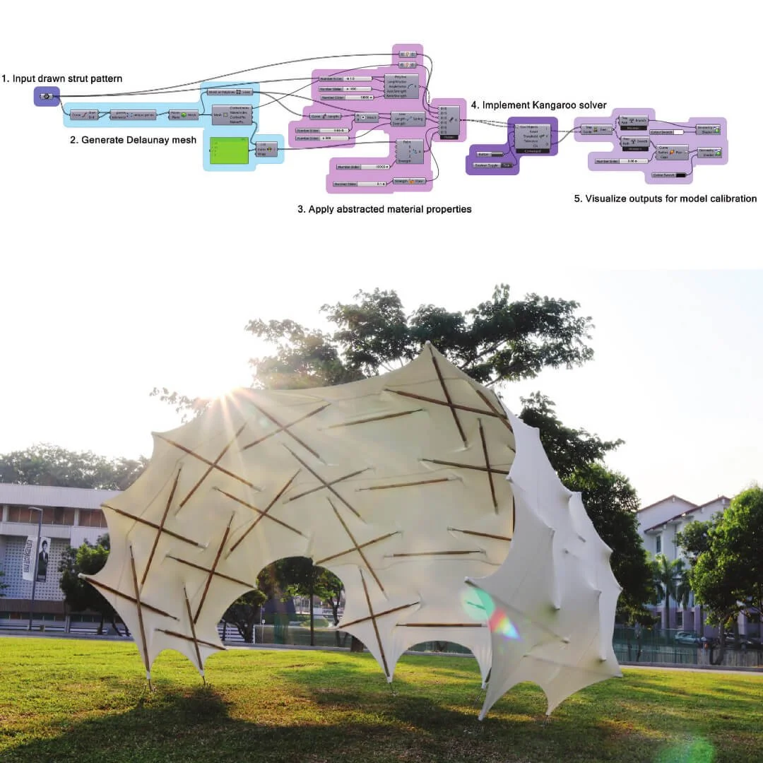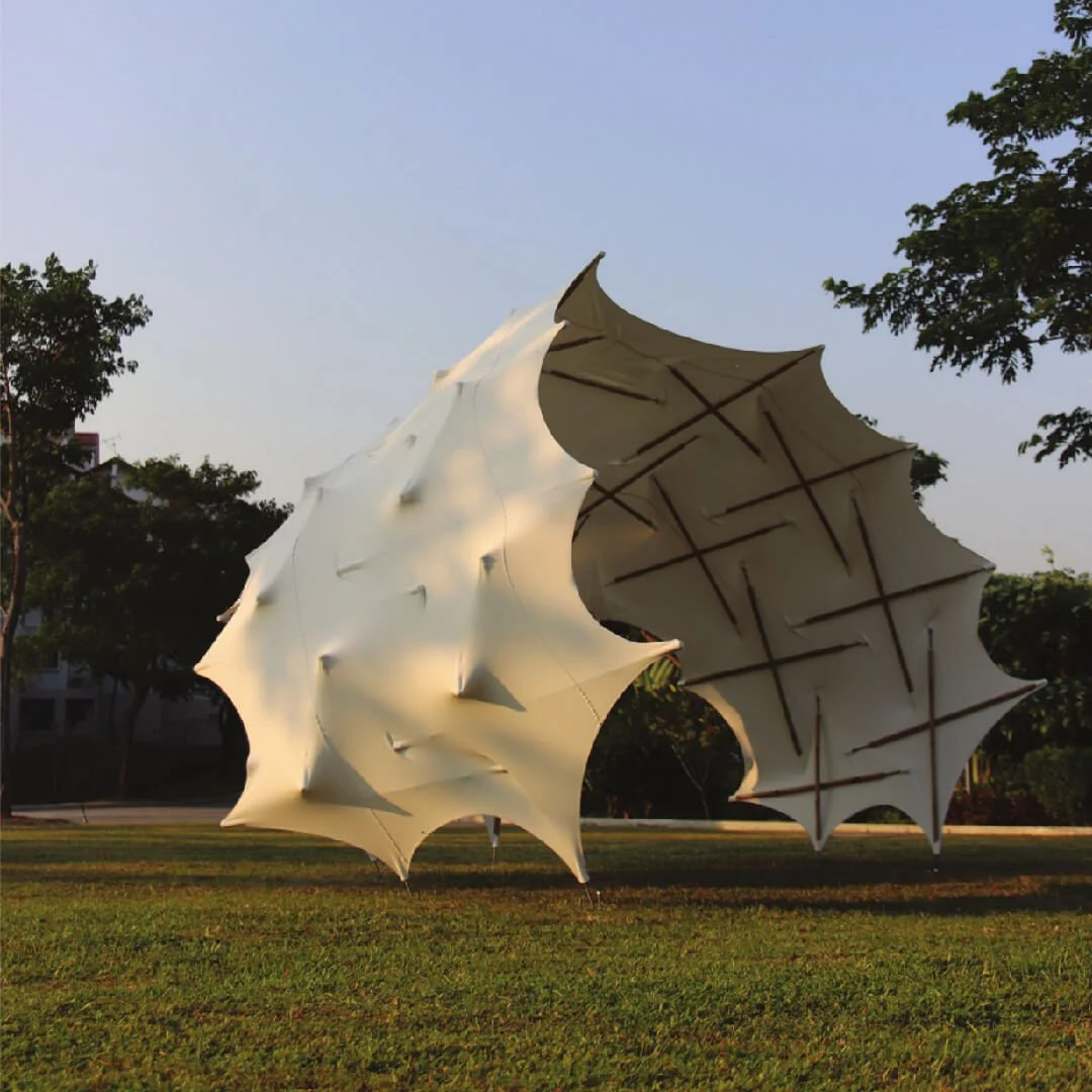 本研究的设计探索源于新加坡科技设计大学(SUTD)的本科课程 Tensile Configurations Studio,聚焦于热带气候下具有最佳气流性能的膜张力整体形态研究。