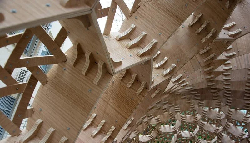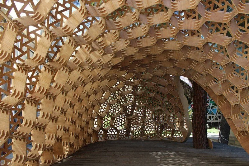 建造结构所用的原料为木材——更具体来说,是由 Garnica 提供的胶合板。根据设计者的说法:“其可持续性、强度、美学,以及易于加工的特性,使木材成为未来建筑新方法中将扮演极其重要角色的材料之一。”