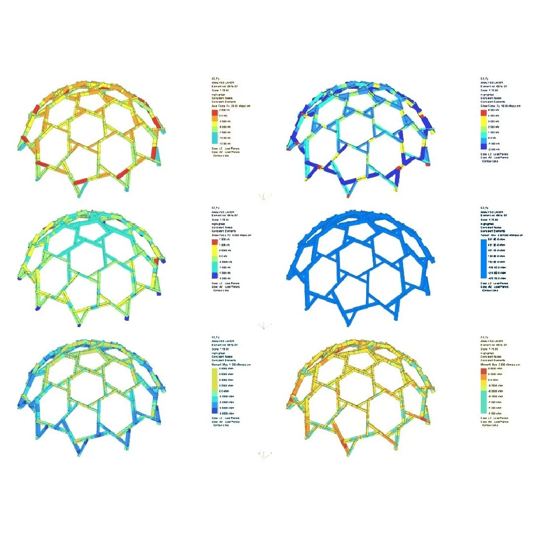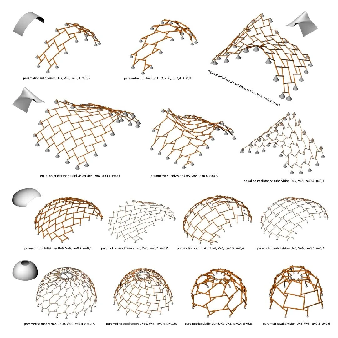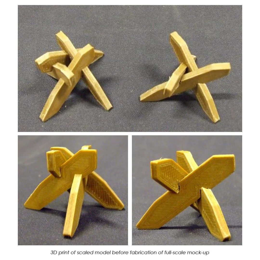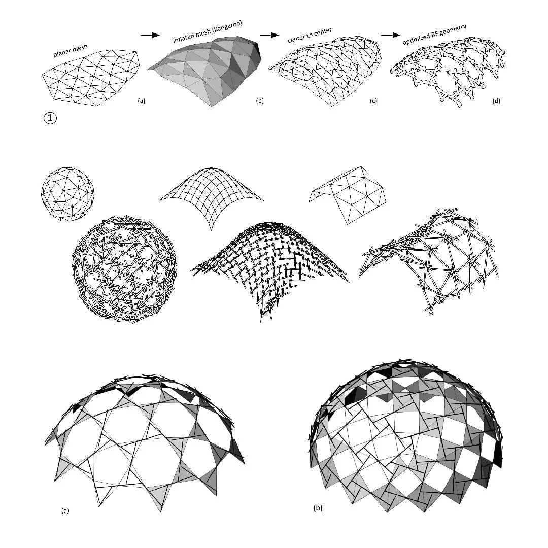 通过与木业行业合作建造的一个全尺寸模型,对"设计到生产"的流程进行了实验验证。上图展示了使用互承框架设计工具(RFD)完成的三个互承框架(RF)设计成果。