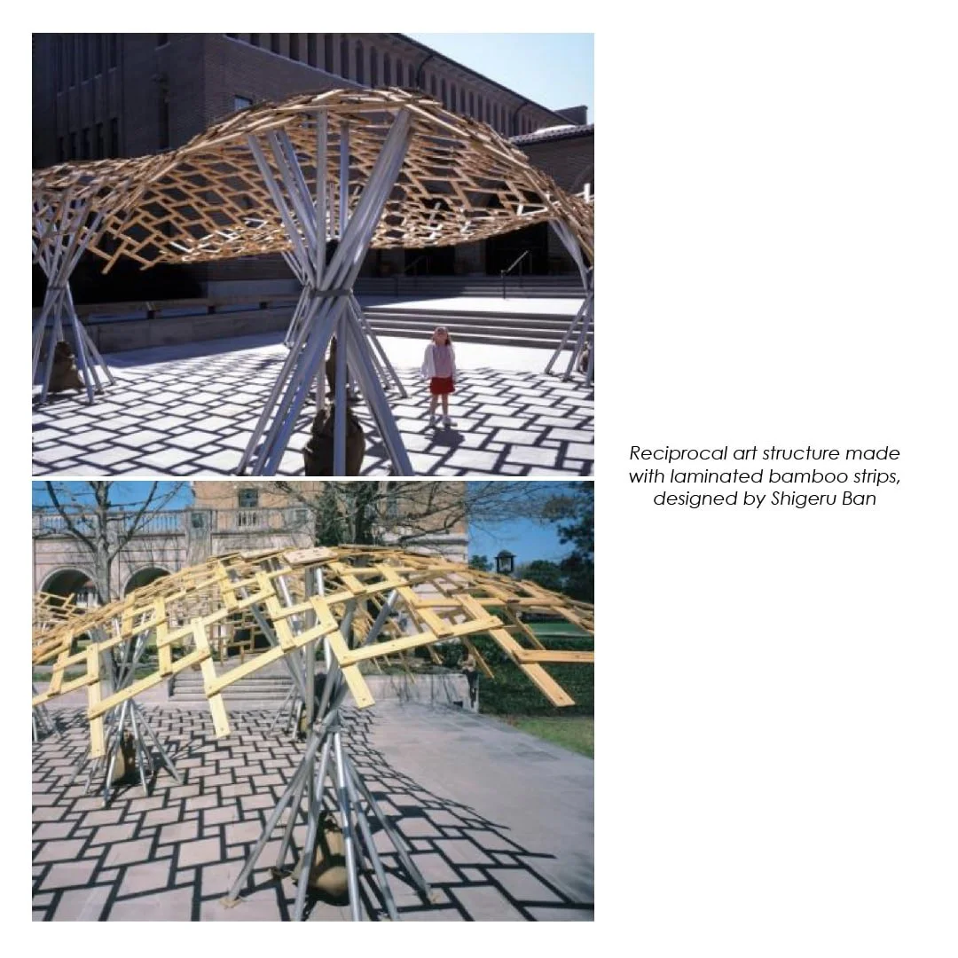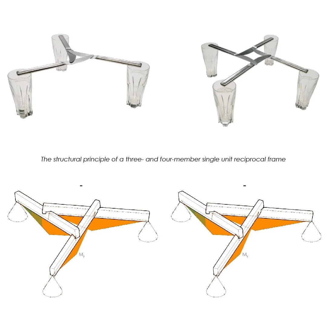 "互承框架"(Reciprocal Frame,简称RF)的定义适用于通过构件之间的循环受压或受拉相互作用而实现的结构。