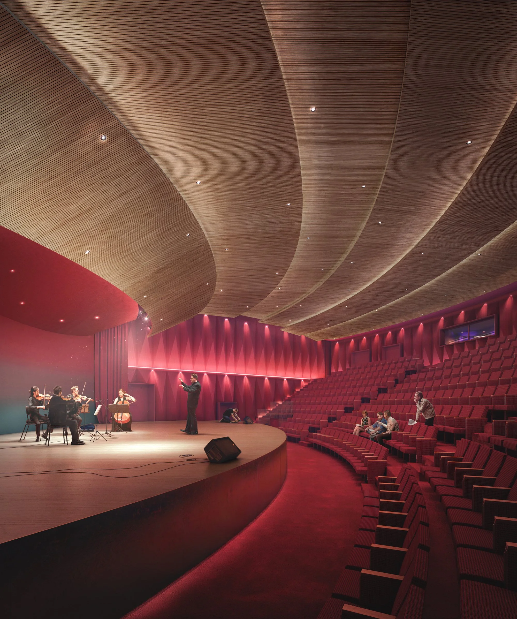 据建筑师所述,这四个独立体量的设计“灵感来源于森林的有机形态和叶片的几何结构”,每栋建筑分别模仿不同的叶片类型。建筑轮廓为曲线形式,内部流线如同风的流动,形成连续的空间序列。所有建筑以阶梯式露台的形式垂直上升,露台作为共享空间。建筑设备系统由 STAIN Engineering 设计,包括一个数字化管理系统,可实时优化能耗并最大限度减少浪费。项目还需要精确的声学控制,为此选用了隐蔽且无干扰的 HVAC 系统,集成了隔音风机盘管和辐射系统,在提供热舒适的同时不影响教学和演出活动。