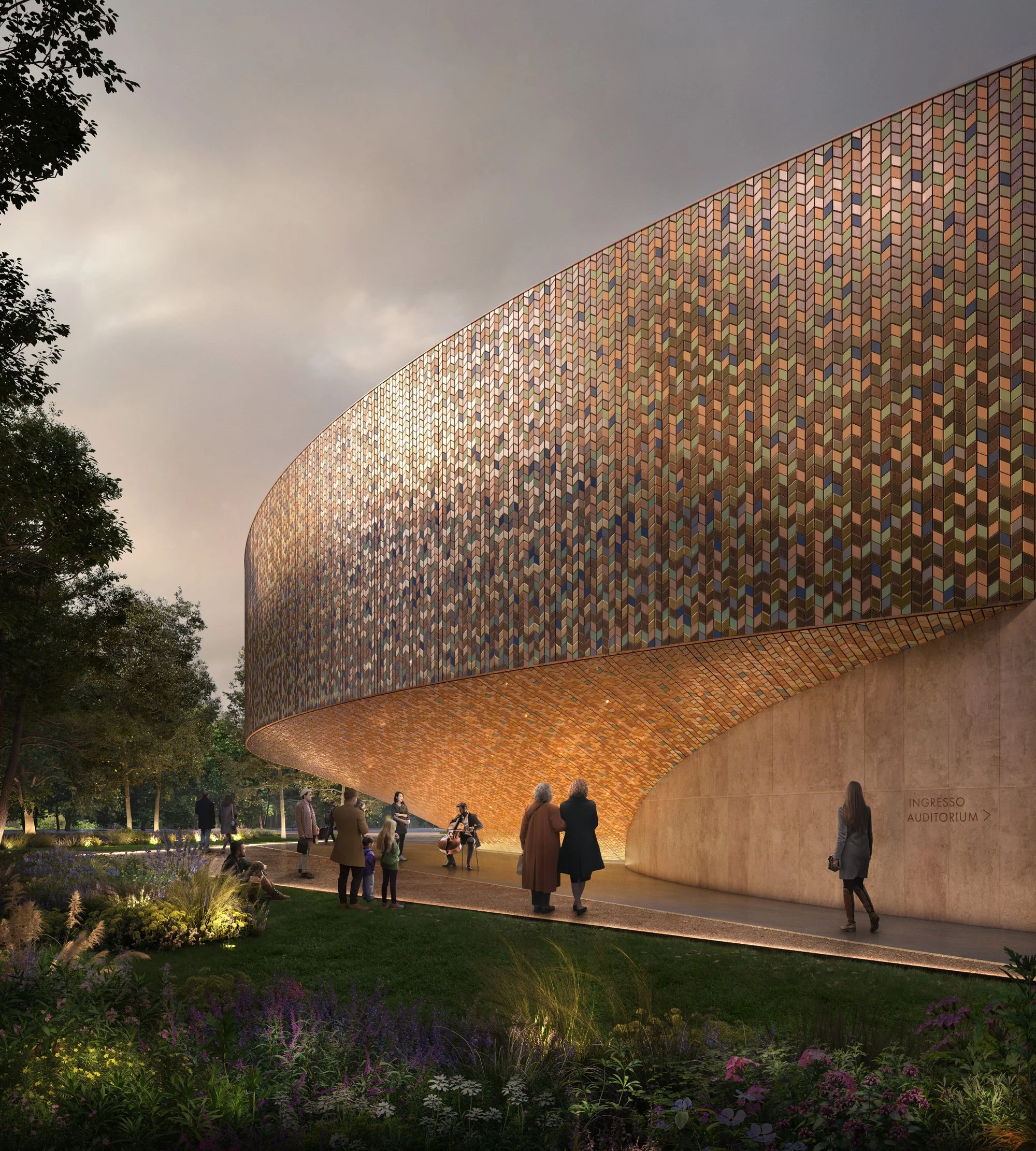 项目包括对 Ex Chimici 建筑的翻新——这是一座独特的圆形建筑,原为化工厂,由 Francesco Griffini 设计,建于 1940 年代。工厂关闭后,该建筑曾用作多家合作社和 Città 2000 公司的办公室,随后空置衰败超过 20 年。翻新后预计将容纳音乐学院的摇滚、流行和爵士音乐学校。整个建筑群还包括另外三座建筑:一个 400 座位的礼堂,外立面采用七种不同色调的陶瓷瓦片;一栋 200 个床位的学生宿舍;以及一栋专用于电子音乐和实验音乐的多功能建筑,内设酒吧、餐厅和共享空间。除这四栋建筑外,前工业用地的规划还包括一个露天音乐竞技场、带电动汽车充电桩的停车场、绿色屋顶和野花草甸。